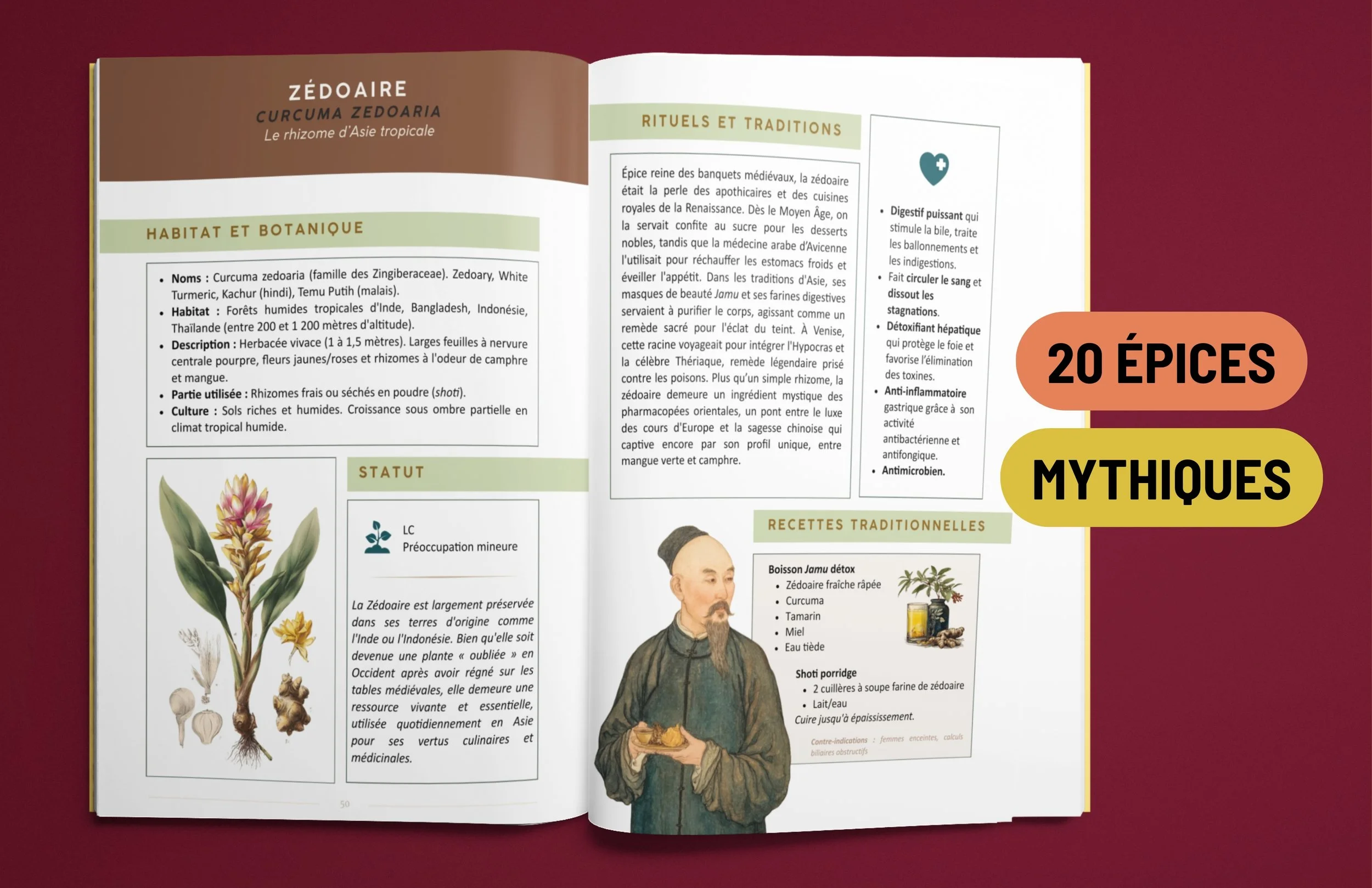 • 20 fiches ethnobotaniques consacrées à des épices anciennes et plantes traditionnellement associées au bien-être naturel.